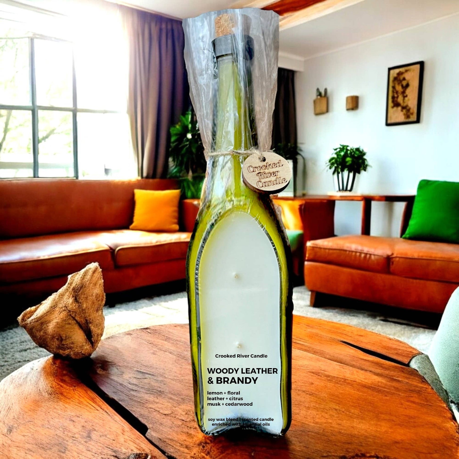 Woody Leather & Brandy -18oz Wine Bottle Candle-Cotton Wicks