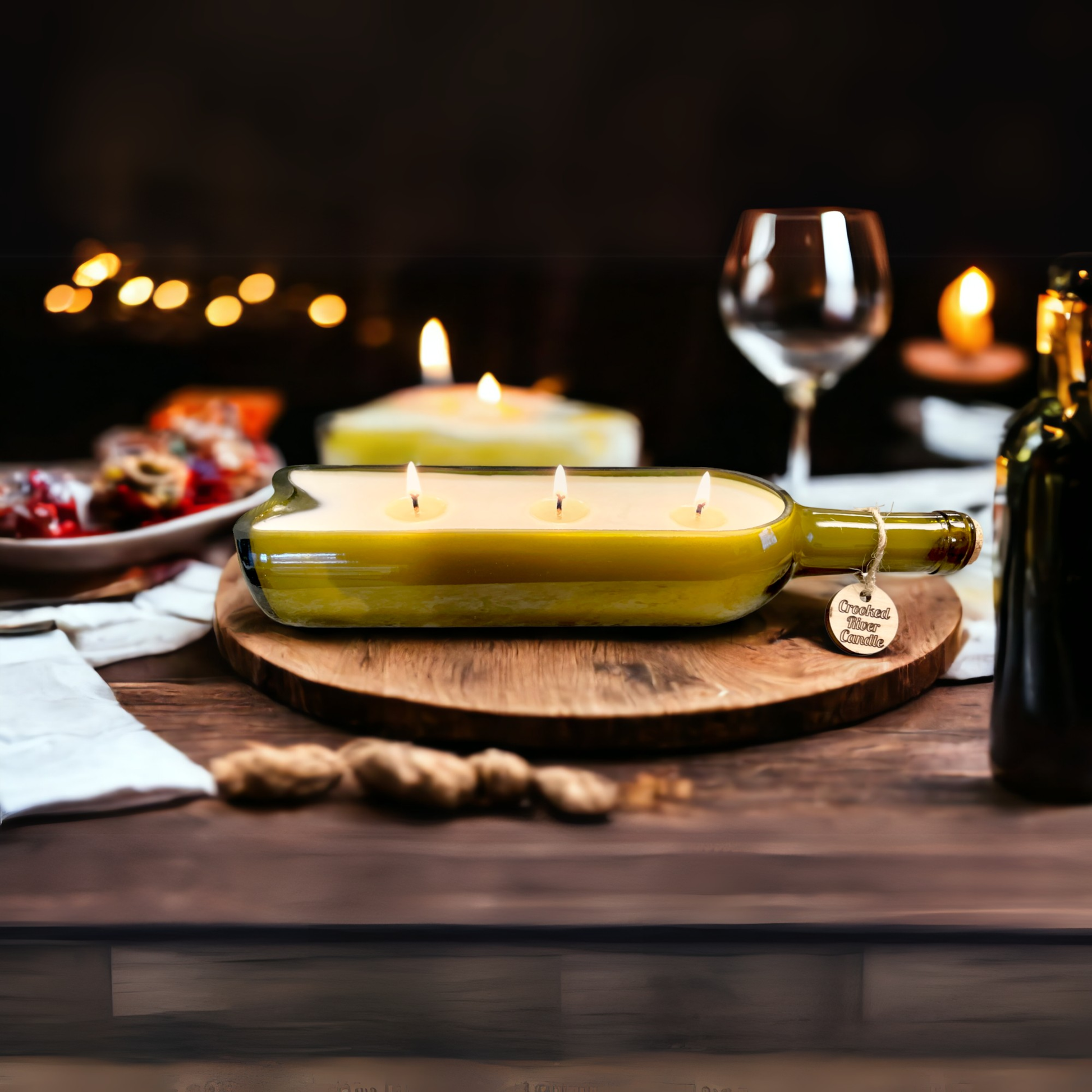 Recycled glass wine bottles are filled with 18 ounces of our soy wax blend and have 3 all cotton, lead free, non-toxic wicks. Colors and shape of vessels may vary and cannot be selected. Colors are clear, light green, and dark green. When purchasing 2 or more we will try to give you some variety in color. Our wine bottle candles come shrink wrapped for display and protection during shipping and are adorned with a signature Crooked River Candle wooden circle. They can be displayed laying down or straight up.
